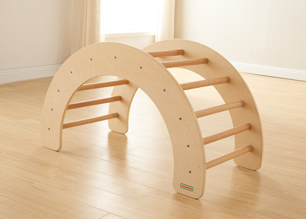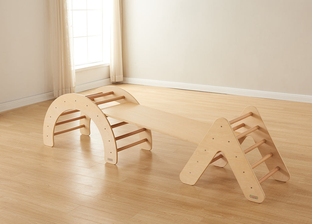 O Arco Pikler pode ser utilizado isoladamente ou em conjunto com o Triângulo de Pikler e Rampa de Pickler, permitindo criar percursos de motricidade variados e ambientes Montessori dinâmicos para aprendizagem ativa.