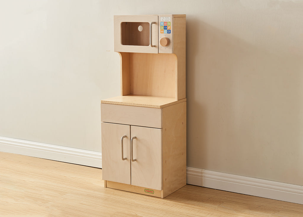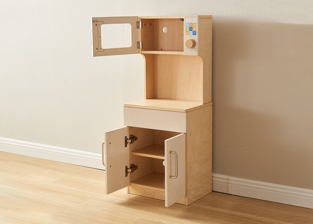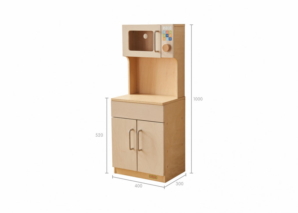 Este louceiro com micro-ondas infantil pode ser usado de forma independente ou combinado com outros módulos da coleção, criando uma cozinha pedagógica completa que encanta crianças e educadores.