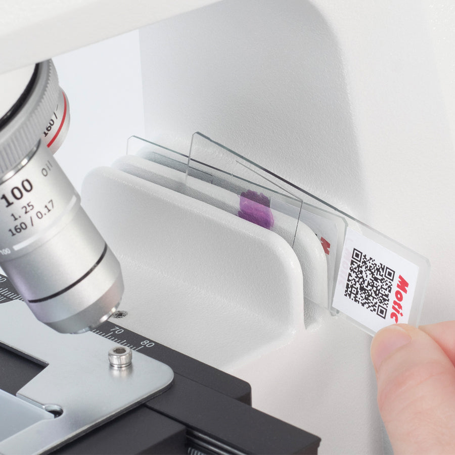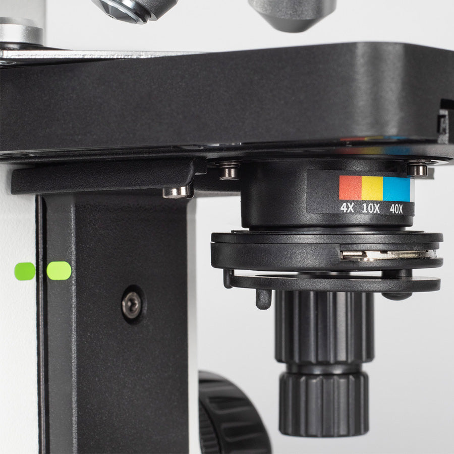 As guias de focagem e o sistema coaxial de focagem macro e micrométrica facilitam a aprendizagem, ajudando os alunos a alcançar a focagem ideal de forma rápida e intuitiva.