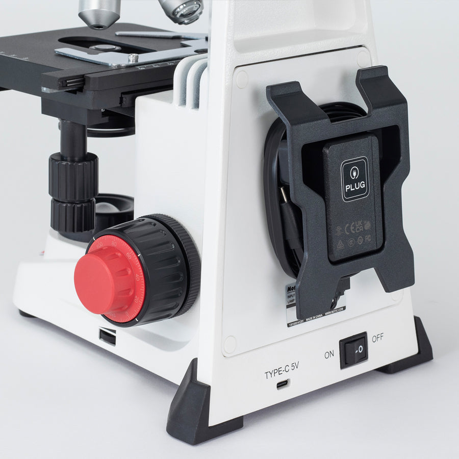 O microscópio está equipado com oculares WF10X/18mm, ajuste de dióptrias no tubo esquerdo e distância interpupilar regulável entre 48–75 mm, garantindo uma adaptação perfeita a diferentes utilizadores. O revólver quádruplo e as objetivas EA Acromáticas DIN proporcionam transições suaves entre diferentes ampliações, mantendo sempre nitidez e contraste.